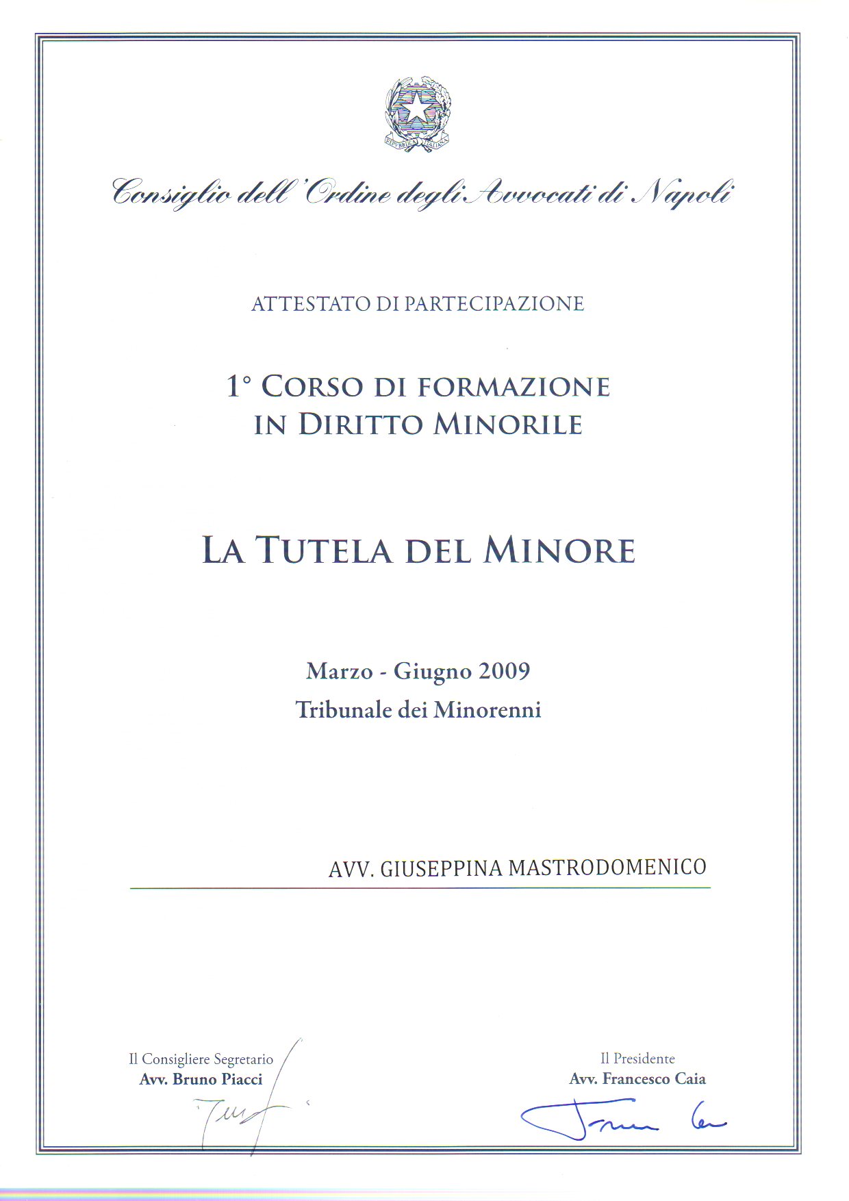 L’ Avvocato Mastrodomenico Giuseppina si è laureata in giurisprudenza presso l’Università degli Studi di Napoli Federico II in data 24/06/1983.